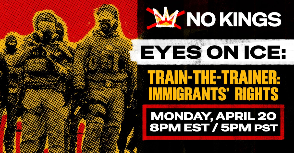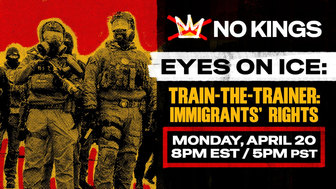 Monday, April 20th | Eyes on ICE: Train-the-Trainer | No Kings, Indivisible & ACLU | 5:00 PM | Online. No Kings, Indivisible, and the ACLU are hosting a virtual train-the-trainer session designed to equip participants to teach others core Know Your Rights topics — the right to remain silent, the right to refuse searches, and the right to record ICE and other law enforcement. If you have organizing reach in your community, this one is built for you. Come ready to learn so you can turn around and teach.