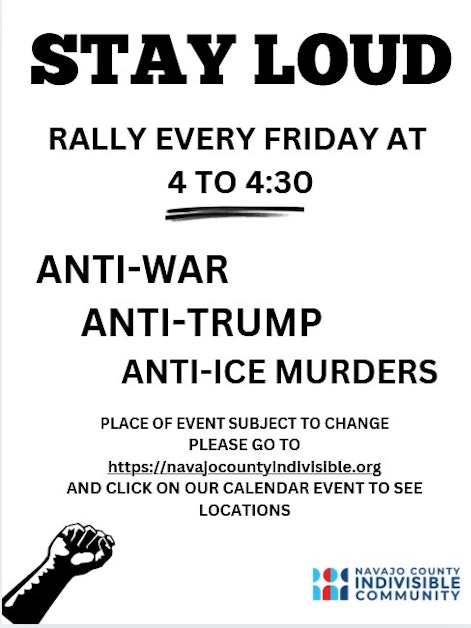 Friday, April 24th | White Mountains Weekly Rally | Navajo County Indivisible | 4:00–4:30 PM | White Mountains. Navajo County Indivisible holds its weekly 30-minute rally to protest the administration, ICE operations, and the ongoing attacks on communities across the country. Location is private — sign up for details. Every Friday, rain or shine.