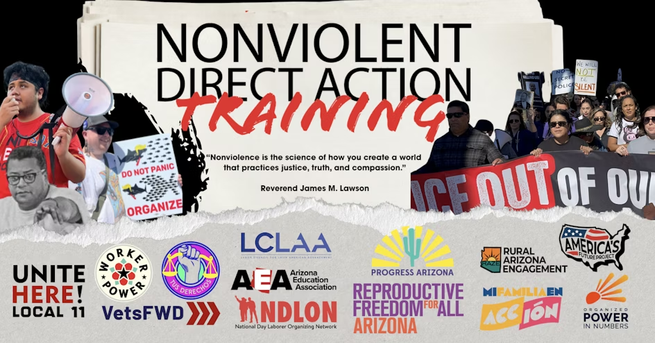 Wednesday, February 25 | Nonviolent Direct Action Training | 5:00 PM | Location Sent Closer to Event: Worker Power, Progress Arizona, Repro Power for All, and coalition partners are hosting an in-person training rooted in the legacy of movement builders like Reverend James M. Lawson. This interactive session covers strategy, group dynamics, creative protest methods, and how to stay grounded and safe during action. Whether you're brand new to organizing or sharpening your edge, this is the training for this moment.