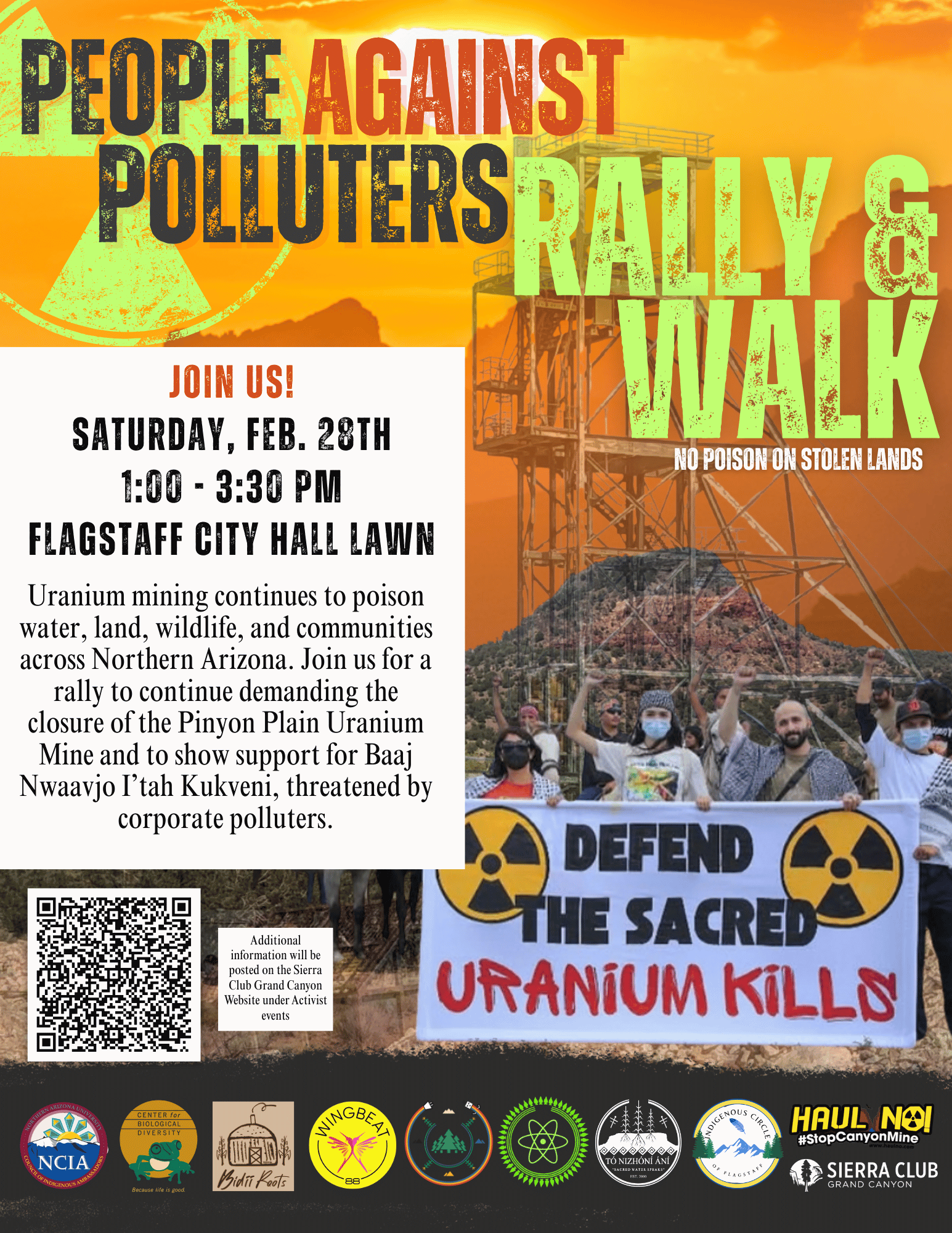 Saturday, February 28 | People Against Polluters Anti-Uranium Extraction Rally | 1:00 PM | Flagstaff City Hall Lawn: The Sierra Club Grand Canyon Chapter is rallying in Flagstaff to demand the continued closure of the Pinyon Plain Uranium Mine. Uranium mining is poisoning water, land, wildlife, and communities across northern Arizona — and corporate polluters are now threatening the regional protections that stand in their way. Show up from 1:00–3:00 PM and make clear that Arizona's land is not for sale!