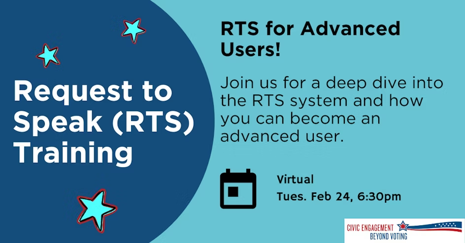 Tuesday, February 24 | Request To Speak (RTS) for Advanced Users | 6:30 PM | Virtual: Civic Engagement Beyond Voting is hosting a training for experienced Request to Speak users who want to go deeper — think custom bill-tracking lists and using the system for serious legislative research. If you're still getting the hang of RTS basics, check out one of CEBV's Monday night trainings first. This one's for the power users.