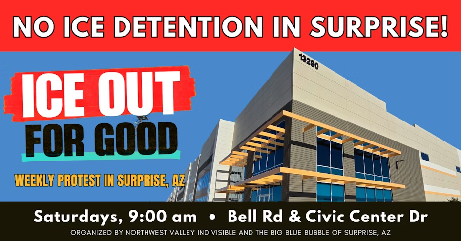 Saturday, February 28 | ICE OUT for Good — No ICE Detention in Surprise | 9:00 AM | Bell Road & Civic Center Drive, Surprise: Northwest Valley Indivisible is showing up every Saturday to oppose the massive ICE detention facility planned for Surprise. Join them at Bell Rd. and Civic Center Dr. to call on Rep. Abe Hamadeh, Rep. Paul Gosar, and Surprise City Council to publicly stand against a facility that threatens the rights and safety of the entire community. Bring signs, bring water, and park on the south side of Bell Rd.